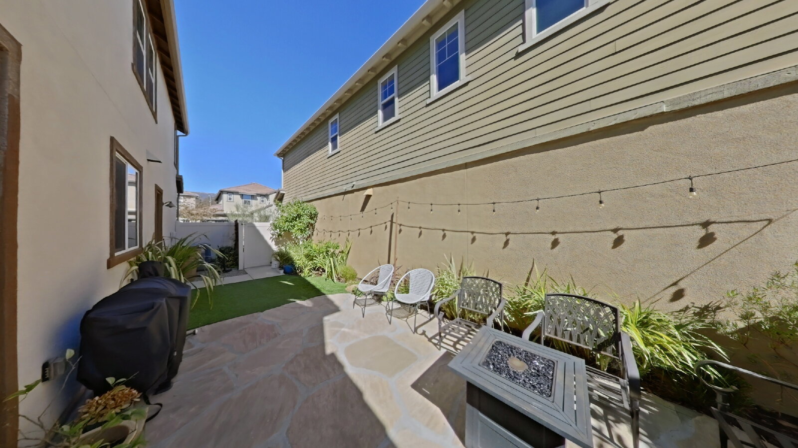 - Private enclosed backyard with stone patio, artificial turf, and room for outdoor dining and relaxation