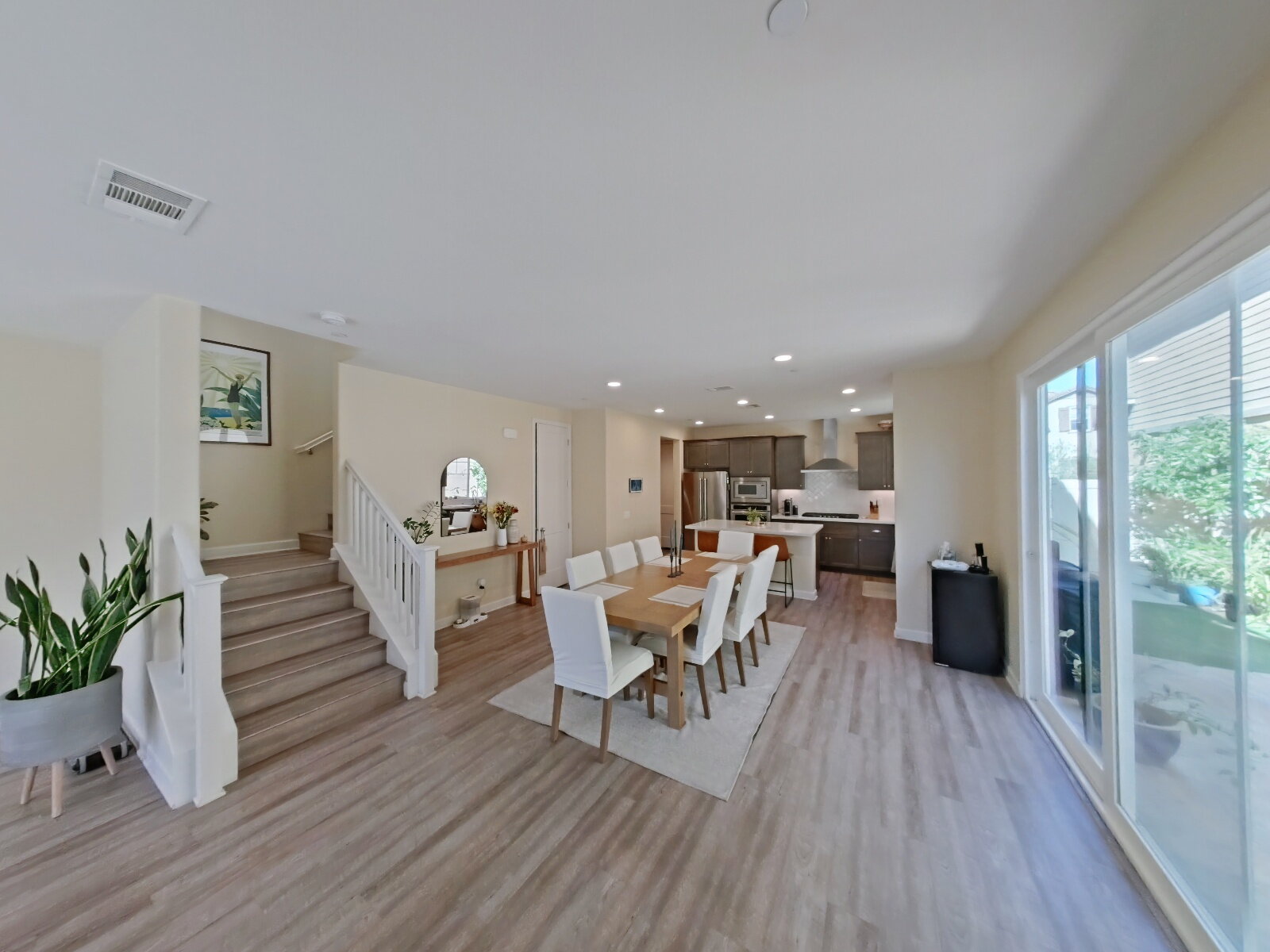 - Chef’s kitchen featuring stainless steel appliances, quartz countertops, and an oversized island that flows seamlessly into the dining and living areas