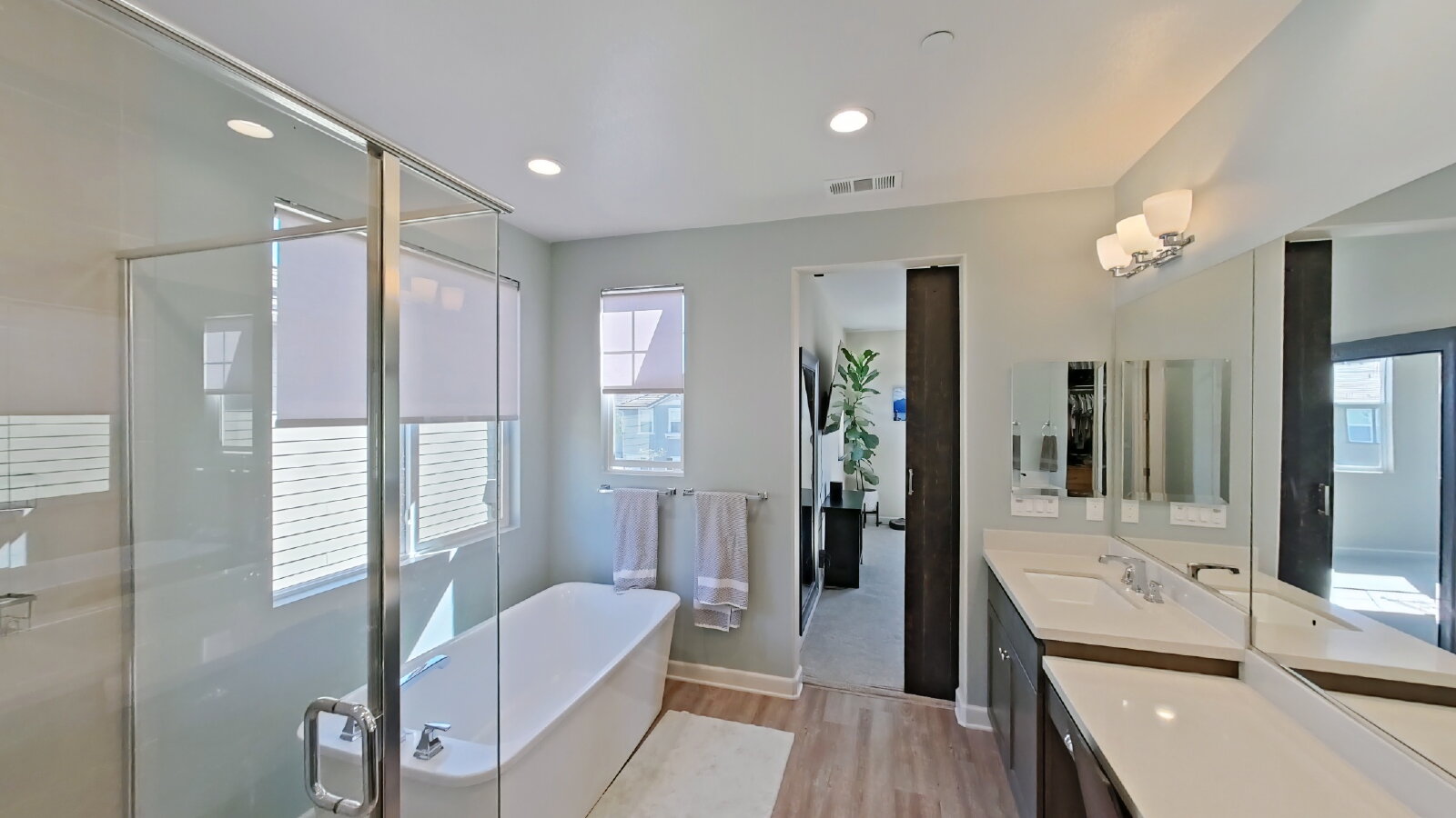 - Primary suite with a large walk-in closet, dual-sink vanity, soaking tub, and walk-in shower
