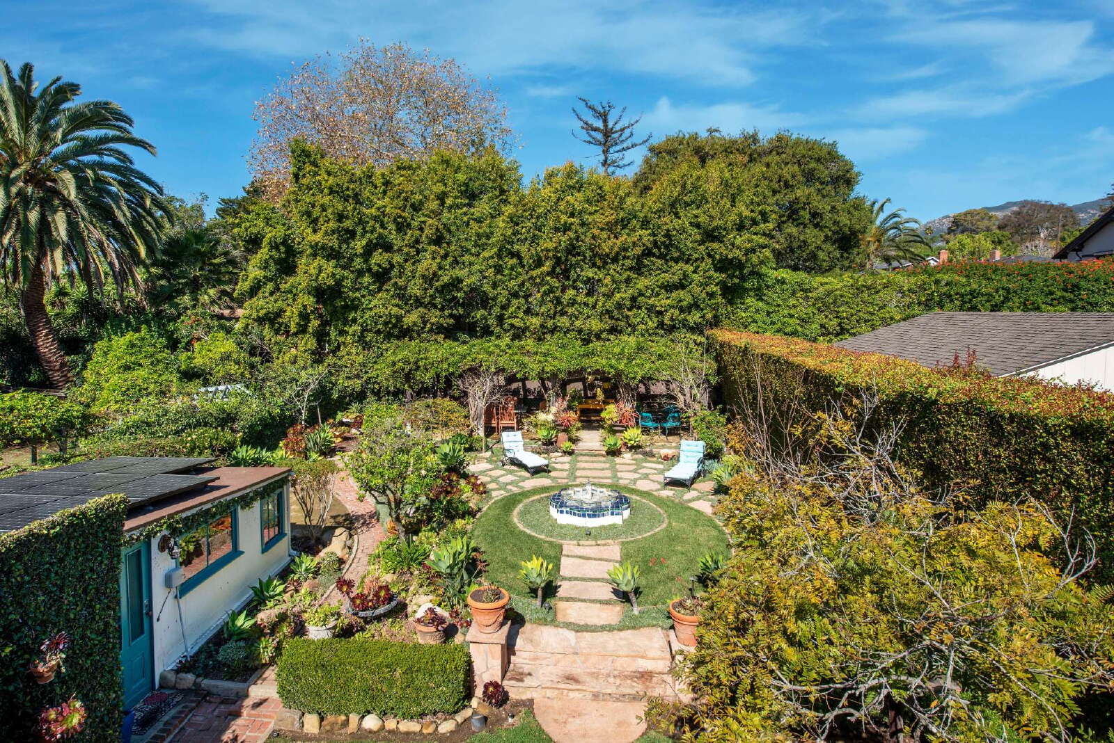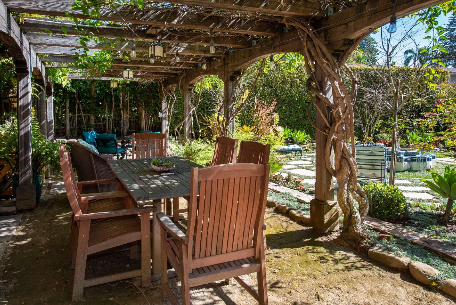 This 1920s craftsman blends historic Santa Barbara charm with a completely renovated kitchen and one of the best private backyards you'll find downtown. Original details have been preserved throughout—hardwood floors, wrought iron accents, arched doorways, and Spanish tile work in both bathrooms. Out back, a vine-covered pergola, fountain, and flagstone paths create a true garden retreat with room to entertain.