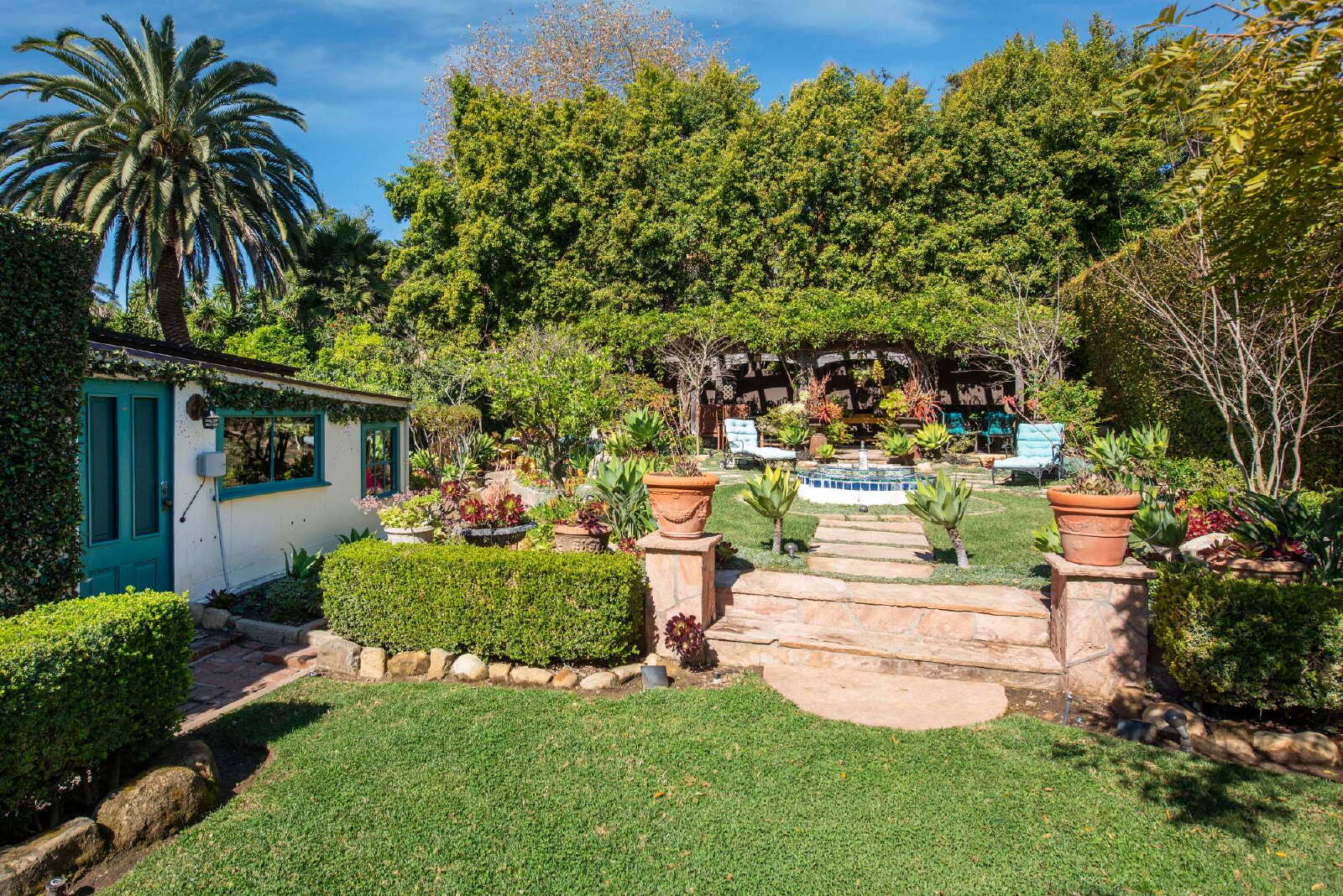 - Resort-style backyard—pergola, fountain, flagstone paths, multiple seating areas
